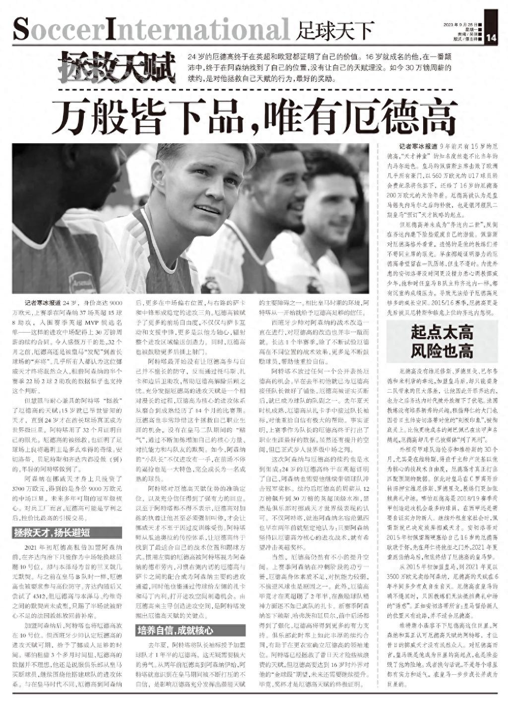 當然,厄德高仍然有不小的提升空間。上賽季阿森納在衝刺階段的功虧一簣,厄德高身體素質不足,對抗能力較弱,不擅逆風球也是原因之一。此外,厄德高畢竟纔在英超踢了2年半,在激勵球隊精神方面還不如已離隊的扎卡。新賽季阿森納簽下賴斯、哈弗茨和廷貝爾,前中後場都得到了強化,厄德高將得到更多的有力支持。俱樂部此時奉上如此豐厚的續約合同,有助於在更衣室確立厄德高的領袖地位。阿特塔已經拯救了昔日天才險些被浪費的天賦,但厄德高要達到16歲時外界對他的“金球級”期望,未來還需要繼續提升。畢竟,獎盃纔是厄德高天賦的終極證明。