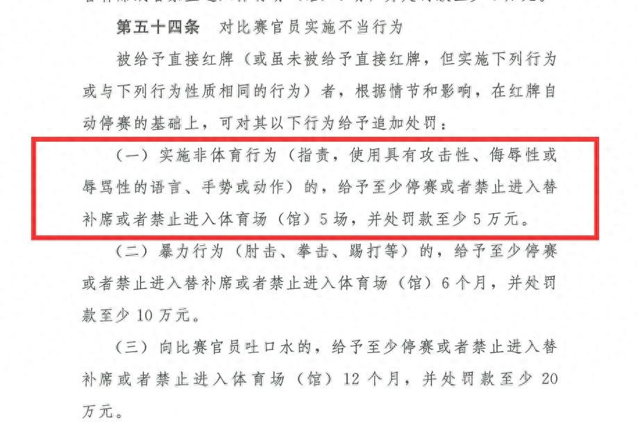 據瞭解,《紀律準則》第五十四條專門提到“對比賽官員實施不當行爲”應被追加處罰的情形,其中第(一)款這樣規定:“實施非體育行爲 (指責,使用具有攻擊性、侮辱性或辱罵性的語言、手勢或動作)的,給予至少停賽或者禁止進入替補席或者禁止進入體育場 (館)5場,並處罰款至少5萬元。”
