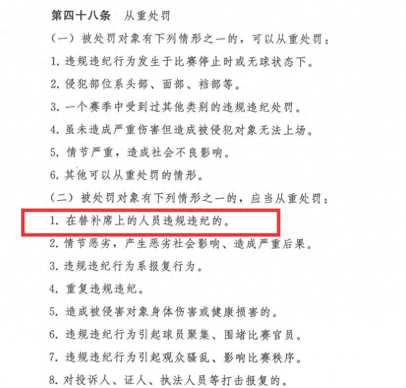 此外,《紀律準則》第四十八條“從重處罰”規定,“在替補席上的人員違規違紀的”, “應當從重處罰”,張稀哲從替補席上衝出去辱罵第四官員,也對應了從重處罰的條款。