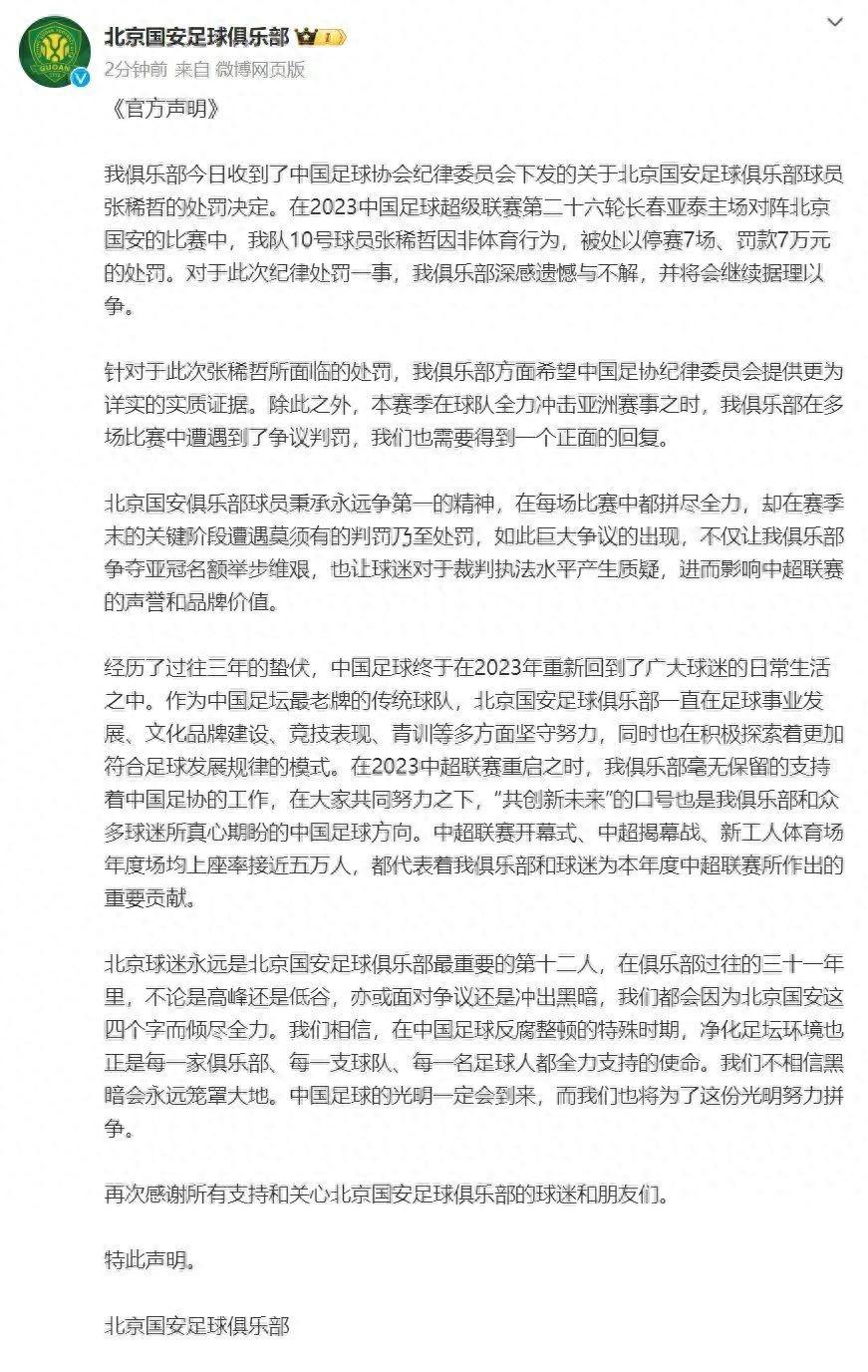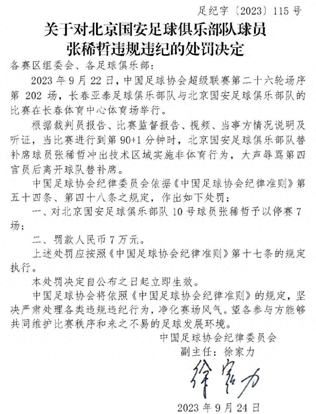 國安俱樂部在第一時間發表了官方聲明:我俱樂部今日收到了中國足球協會紀律委員會下發的關於北京國安足球俱樂部球員張稀哲的處罰決定。在2023中國足球超級聯賽第二十六輪長春亞泰主場對陣北京國安的比賽中,我隊10號球員張稀哲因非體育行爲,被處以停賽7場、罰款7萬元的處罰。對於此次紀律處罰一事,我俱樂部深感遺憾與不解,並將會繼續據理以爭。針對於此次張稀哲所面臨的處罰,我俱樂部方面希望中國足協紀律委員會提供更爲詳實的實質證據。除此之外,本賽季在球隊全力衝擊亞洲賽事之時,我俱樂部在多場比賽中遭遇到了爭議判罰,我們也需要得到一個正面的回覆。