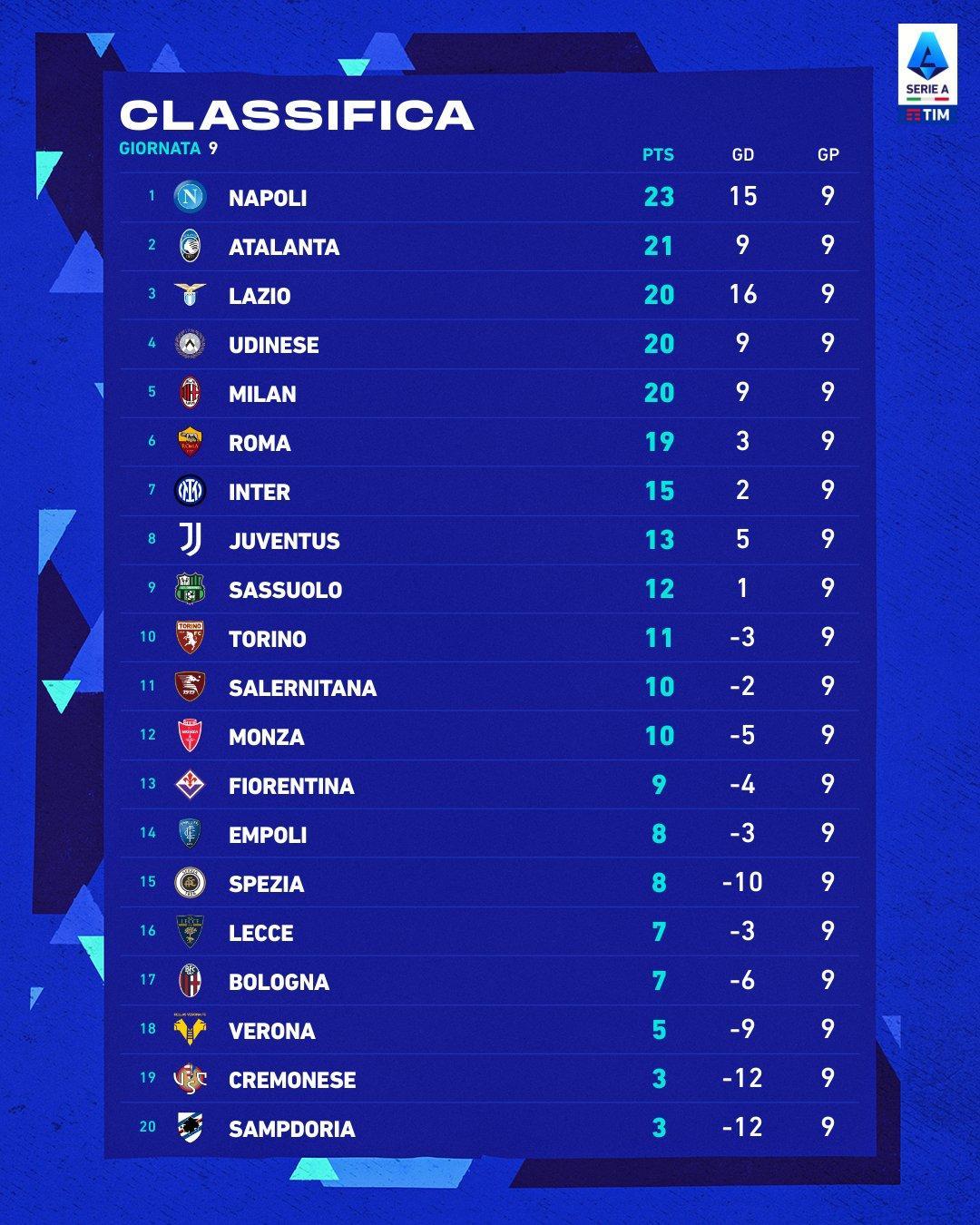 意甲最新積分榜,意甲前6位之間的最大分差也只有4分。除了烏迪內斯之外,那不勒斯、亞特蘭大、拉齊奧、AC米蘭和羅馬都是爭冠和爭四的熱門。
