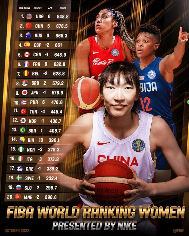 FIBA國際籃聯官網更新女子籃球世界排名,中國女籃上升5位,以676.5分排名世界第二。美國女籃依舊穩居榜首,澳大利亞女籃排名不變位列第三。