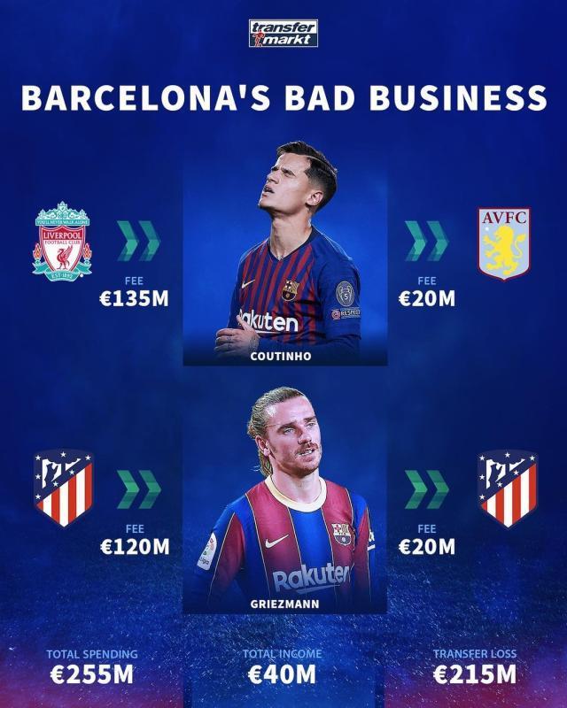 馬競正式宣佈買斷格列茲曼,據德轉統計,巴薩在庫蒂尼奧和格列茲曼的轉會上合計虧了2.15億歐元。巴薩分別以1.35億歐和1.2億歐引進庫蒂尼奧和格列茲曼,但兩人出售的價格均只有2000萬歐。巴薩的“億元先生”目前還有登貝萊在陣中,他的轉會費爲1.25億歐,今夏登貝萊也一度接近自由身離隊,最終於巴薩續約,合同至2024年6月30號。