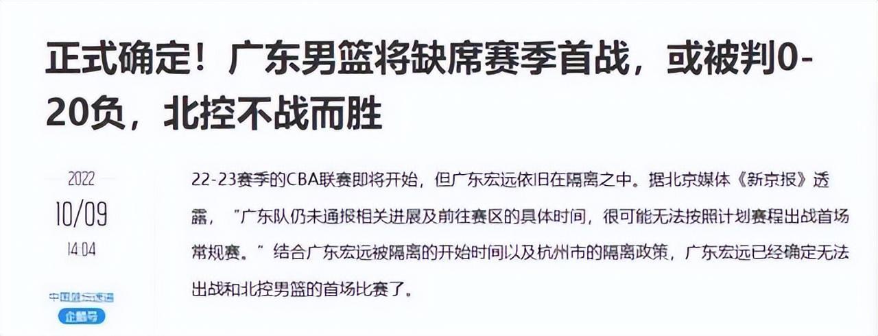 11日上午,CBA官方發佈公告,原定於今天下午15時舉行的廣東VS北控的常規賽,因廣東隊受疫情管控,將無法按時抵達賽區。下午,CBA官方宣佈,廣東隊因自身原因未能參加本場比賽,結果由廣東隊自行承擔,其缺席場次被判負,北控隊獲勝,比分以20比0計。
