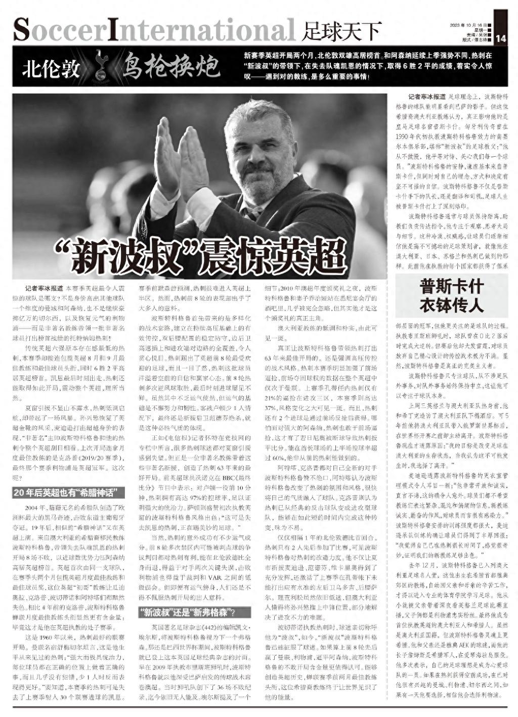 2004年,藉藉無名的希臘隊創造了歐洲盃最大的黑馬奇蹟,擊敗東道主葡萄牙奪冠。19年後,相似的“希臘神話”又在英超上演。來自澳大利亞的希臘裔移民教練波斯特科格魯,帶領失去隊魂凱恩的熱刺開局8場不敗,以進球數優勢力壓阿森納高居英超榜首。英超首次由同一支球隊,在賽季頭兩個月包攬英超月度最佳教練和最佳球員獎,這位英超“初哥”教練讓瓜迪奧拉、克洛普、波切蒂諾和阿特塔們都黯然失色。相比4年前的克洛普,波斯特科格魯蟬聯月度最佳教練頭銜顯然更有含金量:畢竟這纔是他在英超執教的處子賽季。