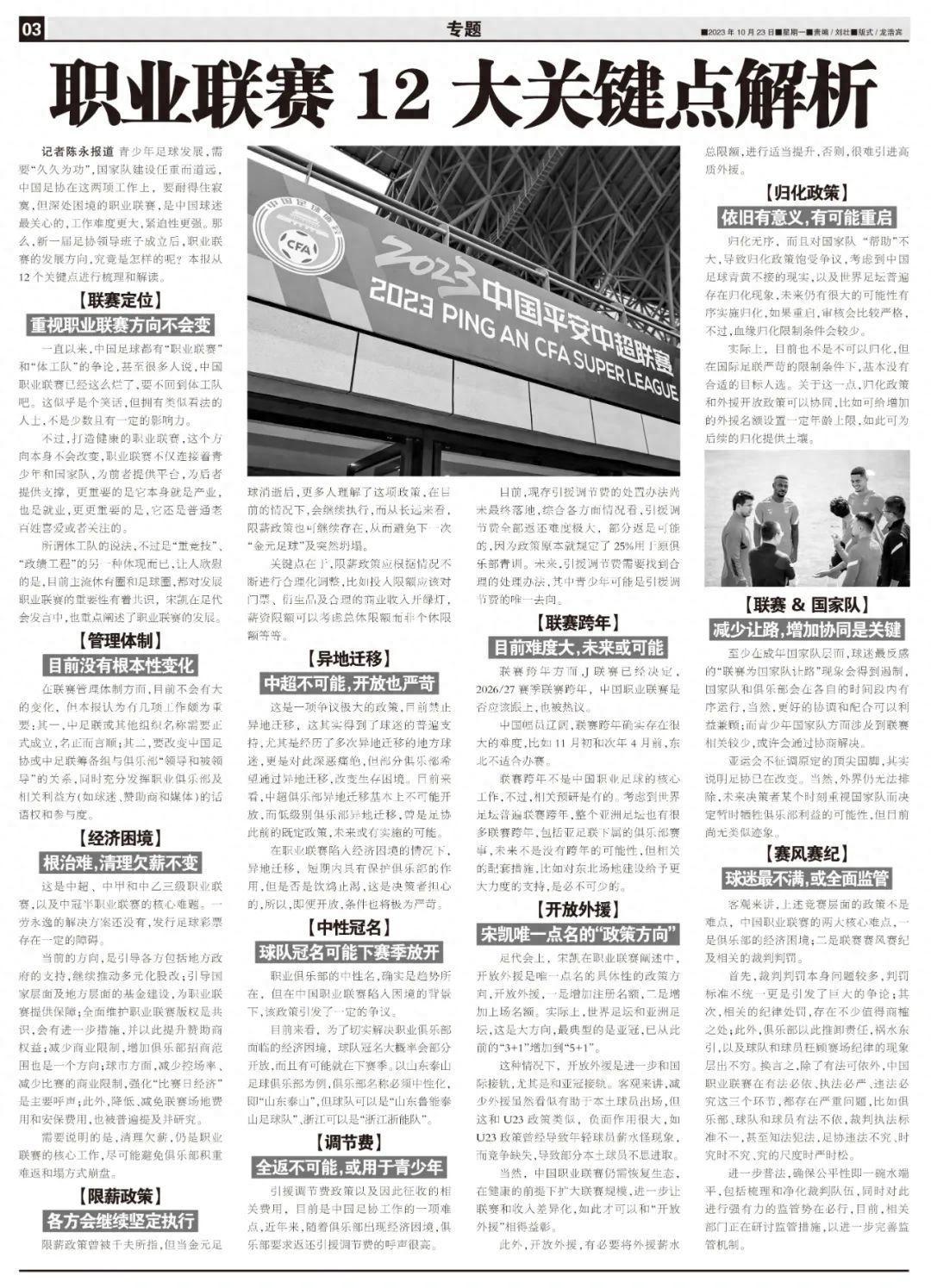 記者陳永報道 青少年足球發展,需要“久久爲功”,國家隊建設任重而道遠,中國足協在這兩項工作上,要耐得住寂寞,但深處困境的職業聯賽,是中國球迷最關心的,工作難度更大,緊迫性更強。那麼,新一屆足協領導班子成立後,職業聯賽的發展方向,究竟是怎樣的呢?本報從12個關鍵點進行梳理和解讀。
