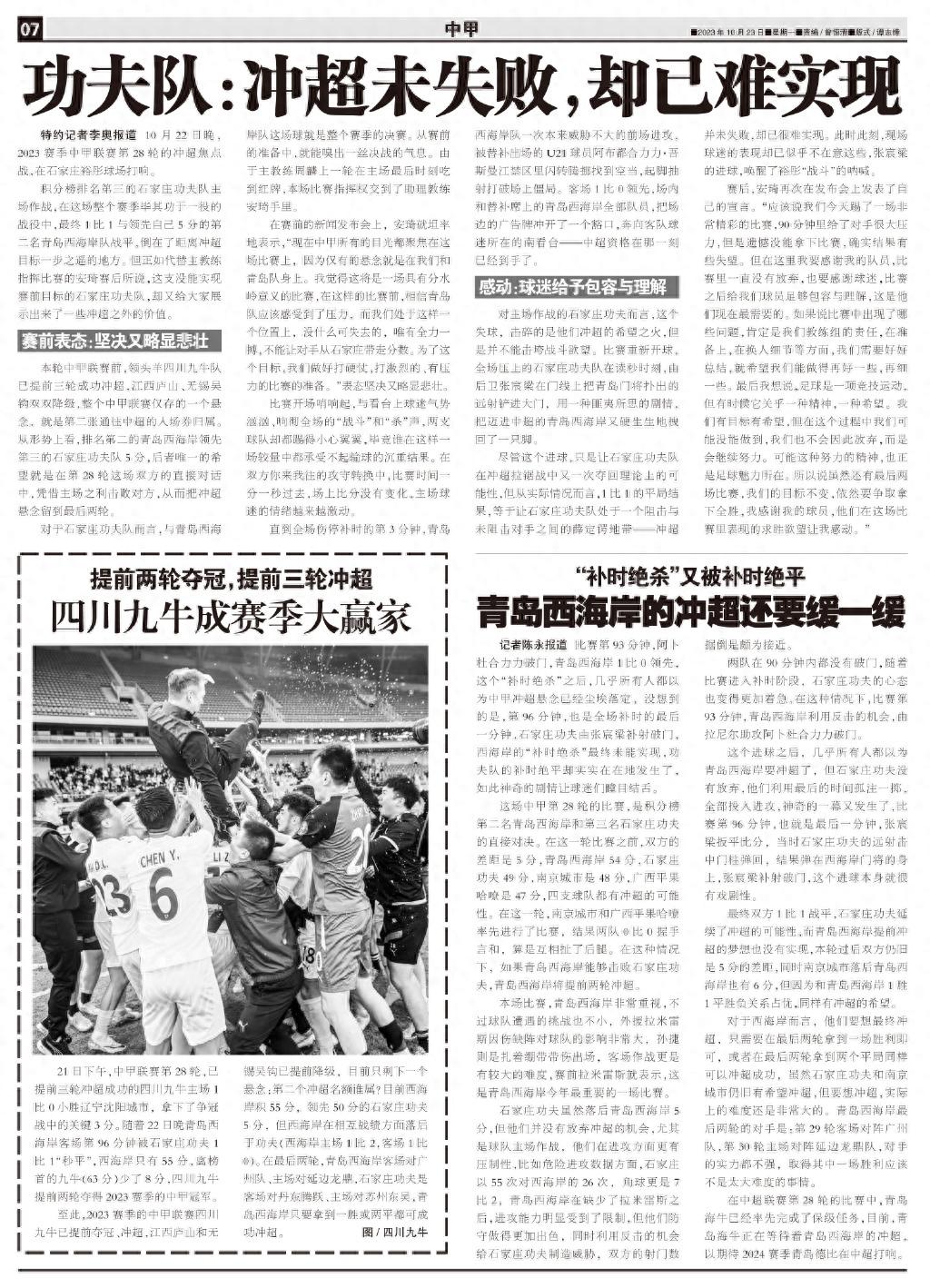 對主場作戰的石家莊功夫而言,這個失球,擊碎的是他們衝超的希望之火,但是並不能擊垮戰鬥慾望。比賽重新開球,全場壓上的石家莊功夫隊在讀秒時刻,由後衛張宸梁在門線上把青島門將撲出的遠射鏟進大門,用一種匪夷所思的劇情,把邁進中超的青島西海岸又硬生生地拽回了一隻腳。