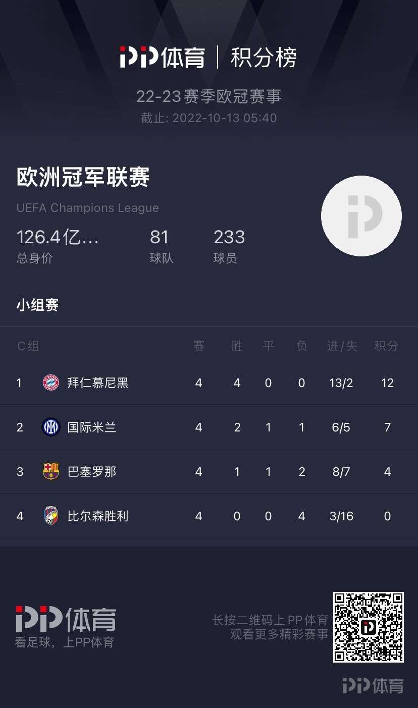 北京時間10月13日凌晨, 歐冠小組賽C組的第4輪比賽戰罷,拜仁4-2擊敗比爾森勝利,巴薩3-3戰平國際米蘭。4輪過後,拜仁4戰4勝積12分提前兩輪小組出線,國際米蘭2勝1平1負積7分,巴塞羅那1勝1平2負積4分,比爾森勝利4戰全敗0分。根據歐冠的出線規則,同分情況將比較相互的勝負關係,國米麪對巴薩勝負關係佔優,這意味着,下輪歐冠,國際米蘭取勝就將提前出線。而巴薩必須後兩輪全勝,同時寄希望於國米後兩輪全都不勝,才能出線。