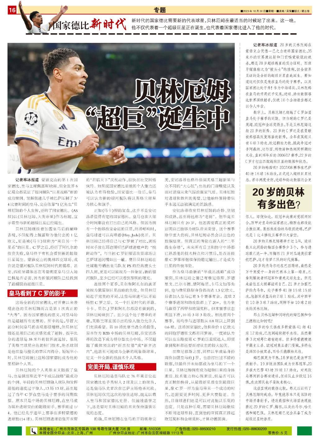 貝林厄姆繼續着加盟皇馬後的巔峯表現,不僅配得上佩雷斯爲他付出的1億歐元,更是被《馬卡》報稱爲“來自另一個星系”的巨星。C羅之後,經歷了阿扎爾的投資失敗,皇馬終於有機會看到新的超級巨星誕生。蒙錐克山的奧林匹克球場,或許就是銀河艦隊貝林厄姆時代的揭幕。甚至,西班牙媒體還在考量明夏皇馬引入姆巴佩是否必要,因爲新銀河艦隊已經找到了最耀眼的超級巨星。