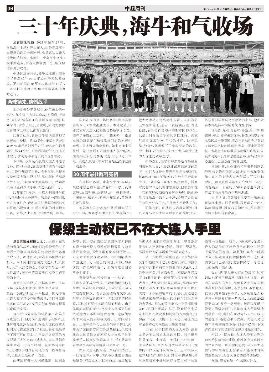 記者陳永報道 2023中超第29輪,青島海牛主場對陣大連人,這是青島海牛本賽季的最後一場比賽,也是客隊大連人保級的關鍵戰。比賽中,青島海牛2比2戰平大連人,後者雖然拿到一分,但保級形勢更加危險。