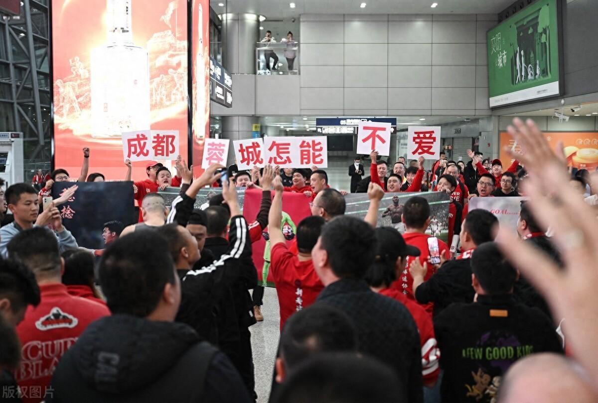 2023年10月30日,成都蓉城衆將客勝北京國安後連夜乘機返回成都,上千名球迷凌晨在機場迎接。部分球迷打出“成都蓉城怎能不愛”標語歡迎球隊凱旋。