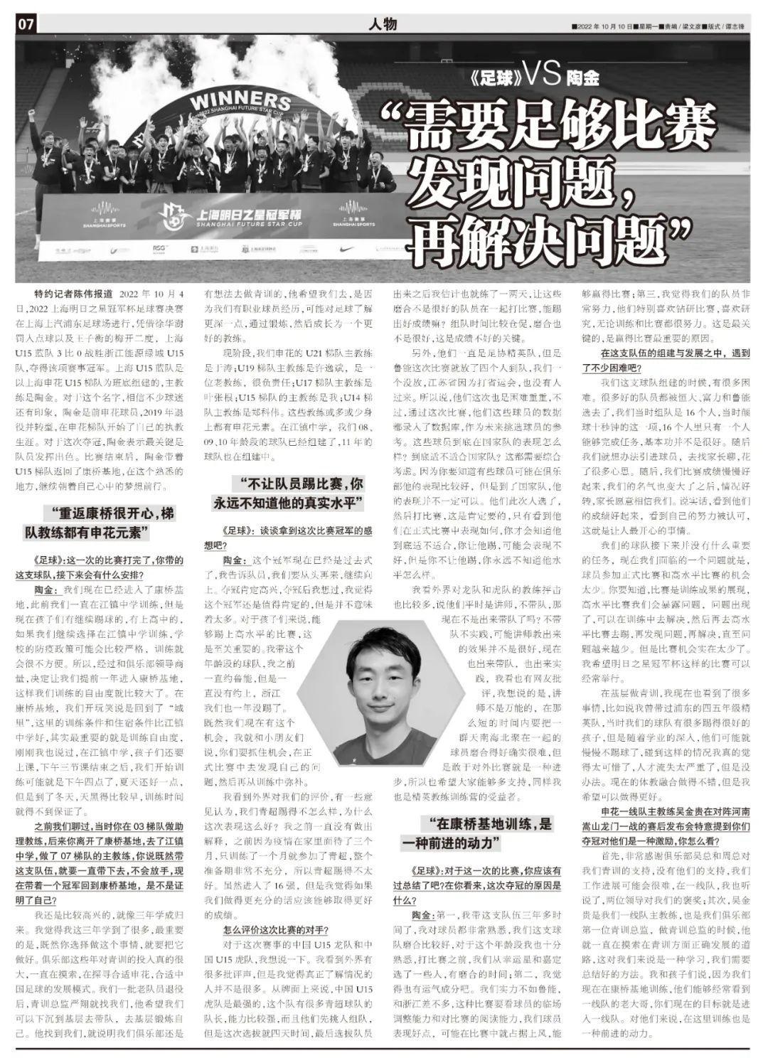 在基層做青訓,我現在也看到了很多事情,比如說我曾帶過浦東的四五年級精英隊,當時我們的球隊有很多踢得很好的孩子,但是隨着學業的深入,他們可能就慢慢不踢球了,碰到這樣的情況我真的覺得太可惜了,人才流失太嚴重了,但是沒辦法。現在的體教融合做得不錯,但是我希望可以做得更好。