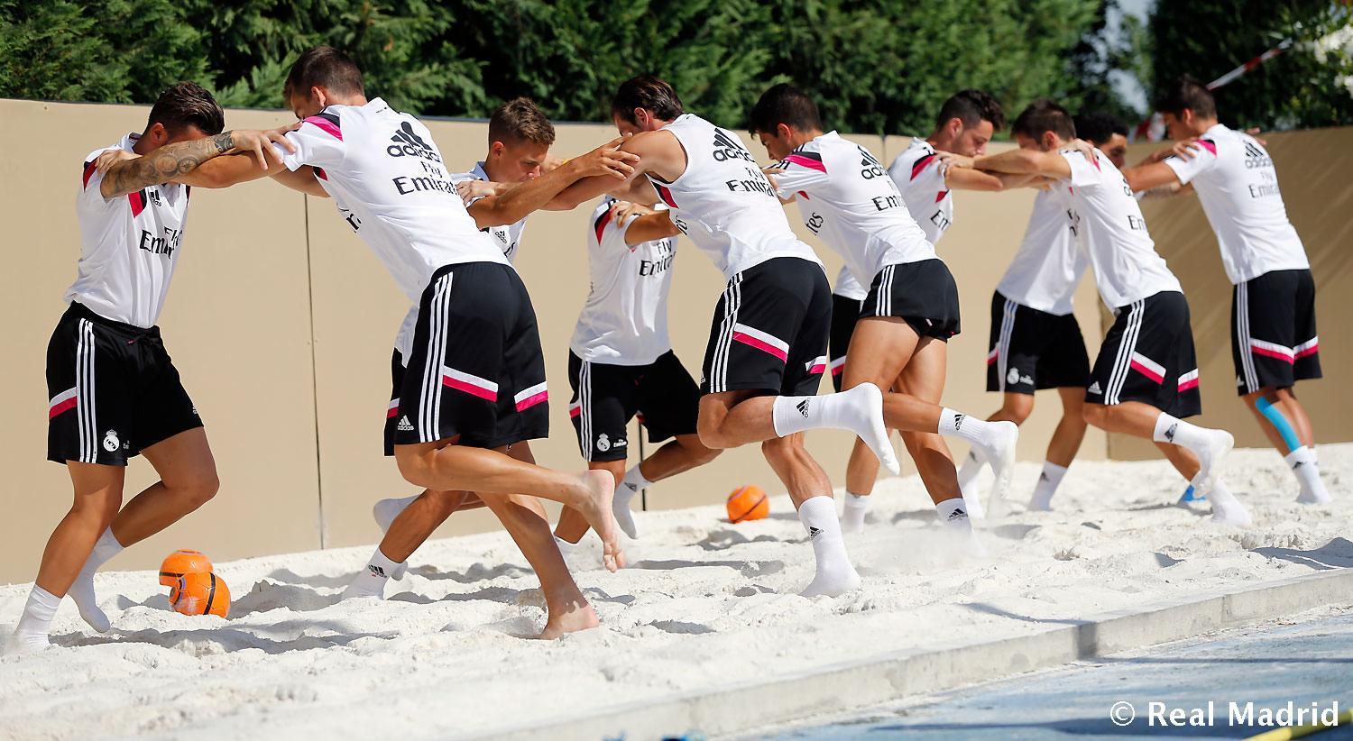 這些視頻中,貝爾和特里都是在沙坑地面進行訓練,這是他們從傷病中恢復的手段之一。而皇馬一直在使用沙坑作爲特殊的訓練手段,以確保球隊在季前和賽季期間日常訓練中,球員可以得到更好的運動表現。相比球員們習以爲常的草地訓練,沙地訓練有諸多優勢。首先是因爲高質量沙地的鬆軟,迫使球員們必須付出更多精力和體力,才能完成在草地上相同的技術動作。相關的比較研究證明:穿鞋和赤腳在沙灘上跑步並無區別,但相比草地都顯示出大約1.5倍的淨有氧能量消耗、2.5倍的淨無氧能量消耗,以及總計1.5倍的能量消耗。