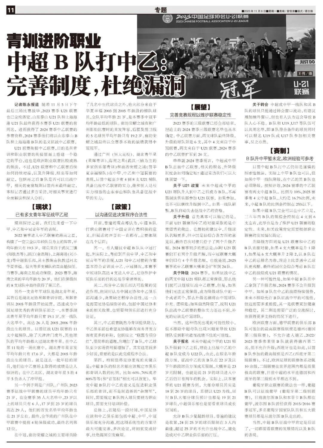 U21聯賽銜接中乙聯賽,目的是在青訓和職業聯賽的銜接層面上搭建一個穩定的平臺,這也是歐洲職業聯賽比較成熟的做法,不過,U21聯賽和中乙聯賽後續如何持續對接,以及升降級、報名等如何敲定,包括再之後B隊是否可以出戰中甲,相關的競賽規則目前尚未最終敲定,本報記者通過多方採訪,對相關事宜進行全面解讀和深入分析。