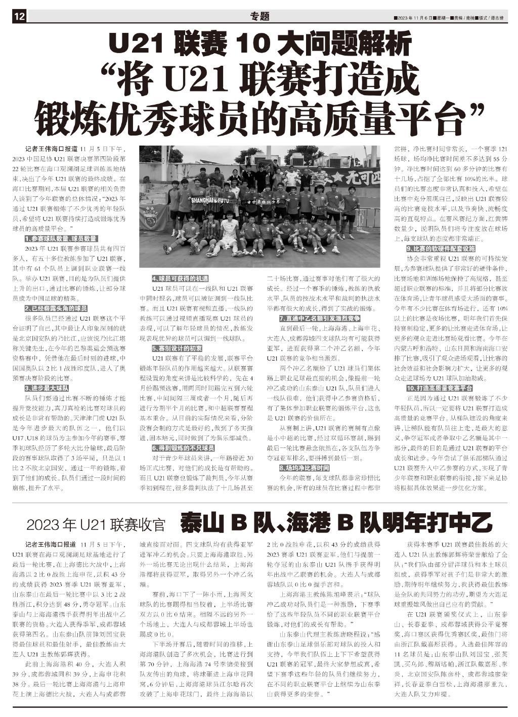 正是因爲通過U21聯賽鍛鍊了不少年輕隊員,所以一定要將U21聯賽打造成高質量的競賽平臺。從梯隊建設的角度來講,讓梯隊能有隊員往上走,是最大的意義,爭奪冠軍或者爭取中乙名額是其中一部分,最終的目的是通過U21聯賽的平臺成長和進步。今年嘗試了俱樂部梯隊通過U21聯賽升入中乙參賽的方式,實現了青少年聯賽和職業聯賽的銜接,接下來足協將根據具體效果進一步優化方案。