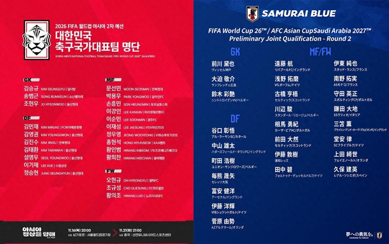 記者寒冰報道 11月8日,繼韓國和中國後,日本公佈了36強賽26人大名單,從留洋球員的數量和質量上看,中韓都不如日本,尤其是中國隊,之前有武磊,去年有李磊,如今,只剩“降級”到土甲的吳少聰,雖然巴西有歸化球員,但揚科維奇並未徵召。