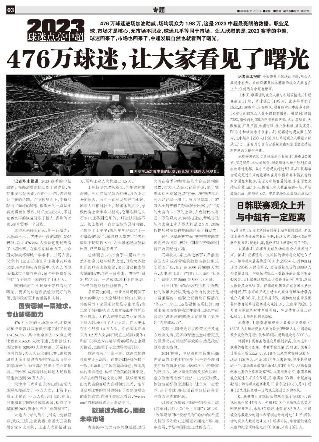 展望未來任重道遠,但一道曙光讓人激動不已,這便是中超的球迷:2023賽季,總計4763464人次球迷現場觀看了中超比賽。在俱樂部球市方面,北京國安和成都蓉城一票難求,並駕齊驅;天津津門虎、山東泰山和上海申花球市火爆,交相輝映;青島海牛、大連人等俱樂部球市也頗有亮點,16箇中超俱樂部中有13個場均上座超過了1.5萬人。