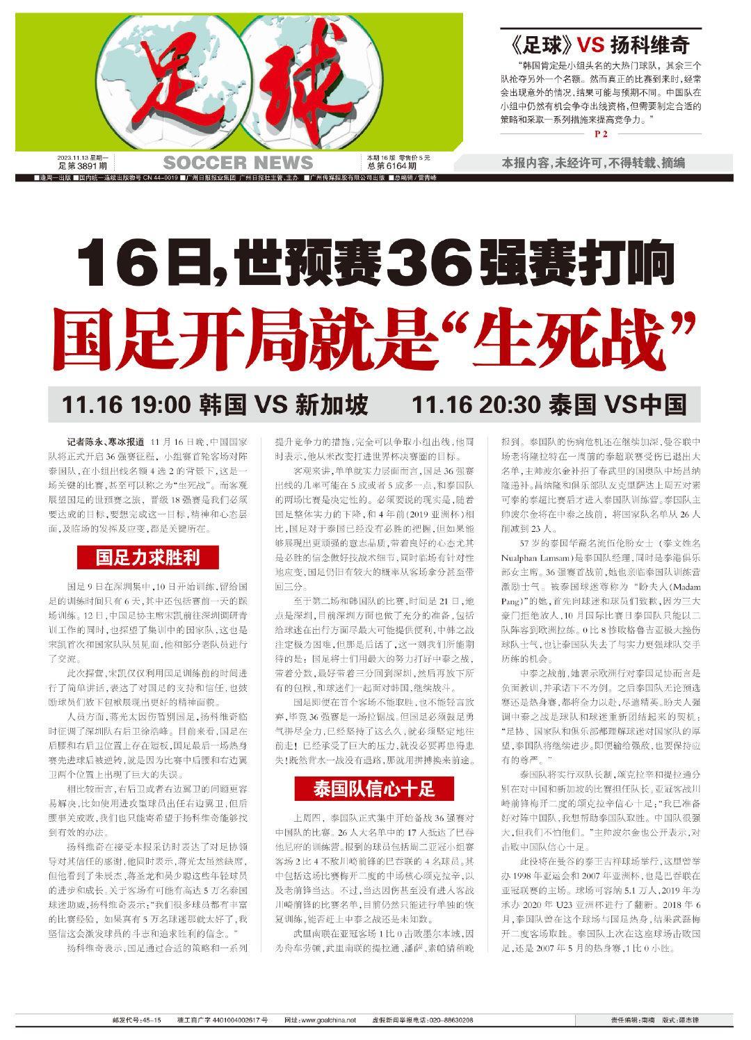 記者陳永、寒冰報道 11月16日晚,中國國家隊將正式開啓36強賽征程,小組賽首輪客場對陣泰國隊,在小組出線名額4選2的背景下,這是一場關鍵的比賽,甚至可以稱之爲“生死戰”。而客觀展望國足的世預賽之旅,晉級18強賽是我們必須要達成的目標,要想完成這一目標,精神和心態層面,及臨場的發揮及應變,都是關鍵所在。