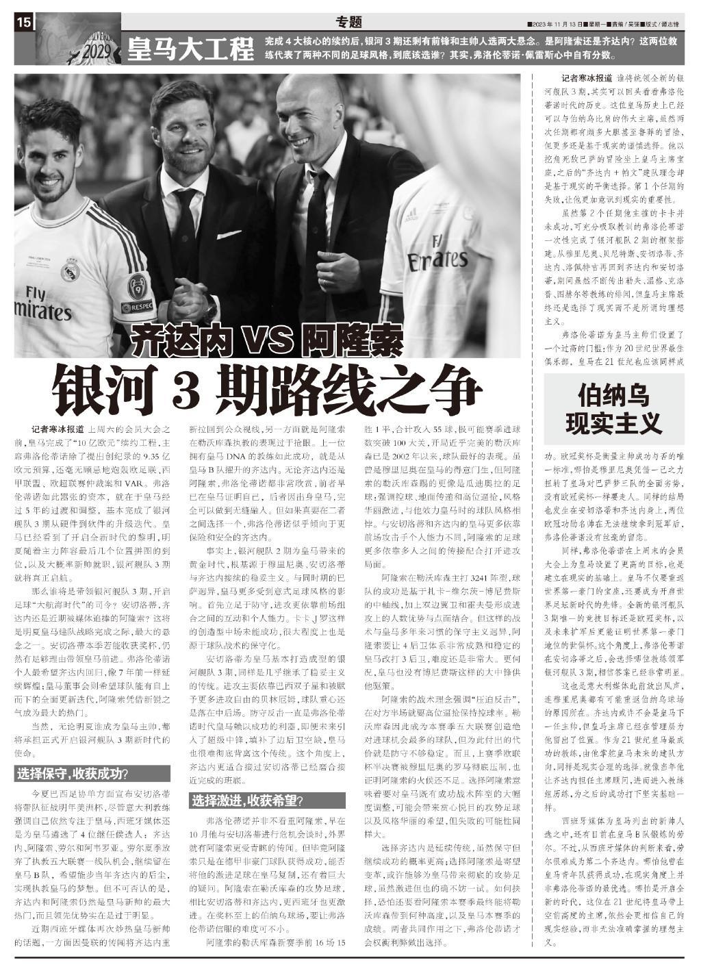 完成4大核心的續約後,銀河3期還剩有前鋒和主帥人選兩大懸念。是阿隆索還是齊達內?這兩位教練代表了兩種不同的足球風格,到底該選誰?其實,弗洛倫蒂諾·佩雷斯心中自有分數。