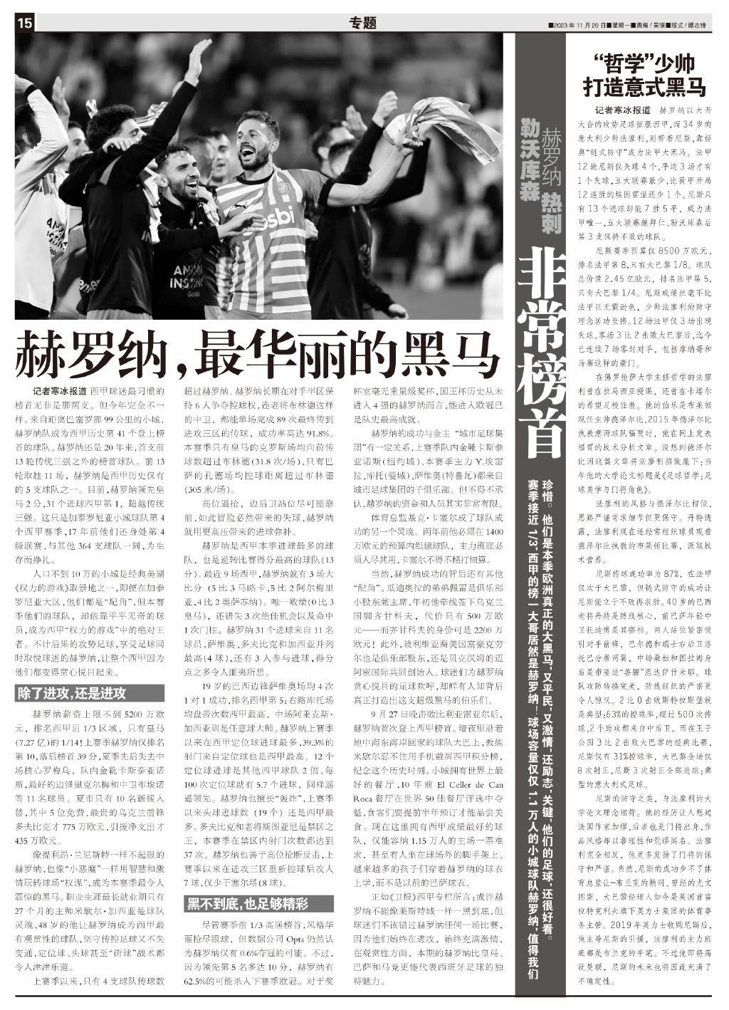 記者寒冰報道 西甲球迷最習慣的榜首無非是那兩支。但今年完全不一樣。來自距離巴塞羅那99公里的小城,赫羅納隊成爲西甲歷史第41個登上榜首的球隊。赫羅納還是20年來,首支前13輪傳統三強之外的榜首球隊。前13輪取勝11場,赫羅納是西甲歷史僅有的5支球隊之一。目前,赫羅納領先皇馬2分,31個進球西甲第1,超越傳統三強。這只是加泰羅尼亞小城球隊第4個西甲賽季,17年前他們還身處第4級聯賽,與其他364支球隊一同,爲生存而掙扎。