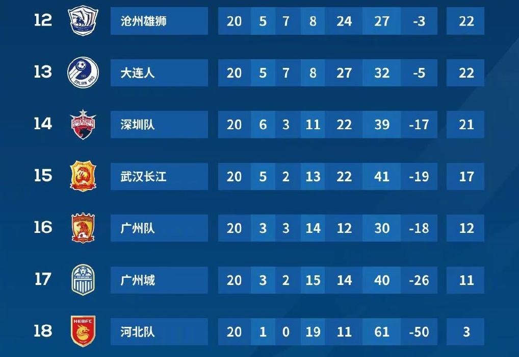 當然,目前積21分排名倒數第五的深圳隊和積22分排名倒數第六的大連人隊也有一定風險,這些球隊想要提早上岸還需要儘快拿到想要的積分。