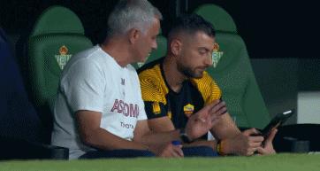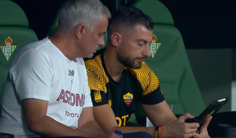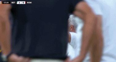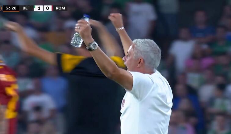 59歲的穆里尼奧再造名場面。當VAR還在劃線的時候,穆里尼奧通過助教福蒂手持的平板看了錄像回放後,直接起身展開雙臂怒吼慶祝了。