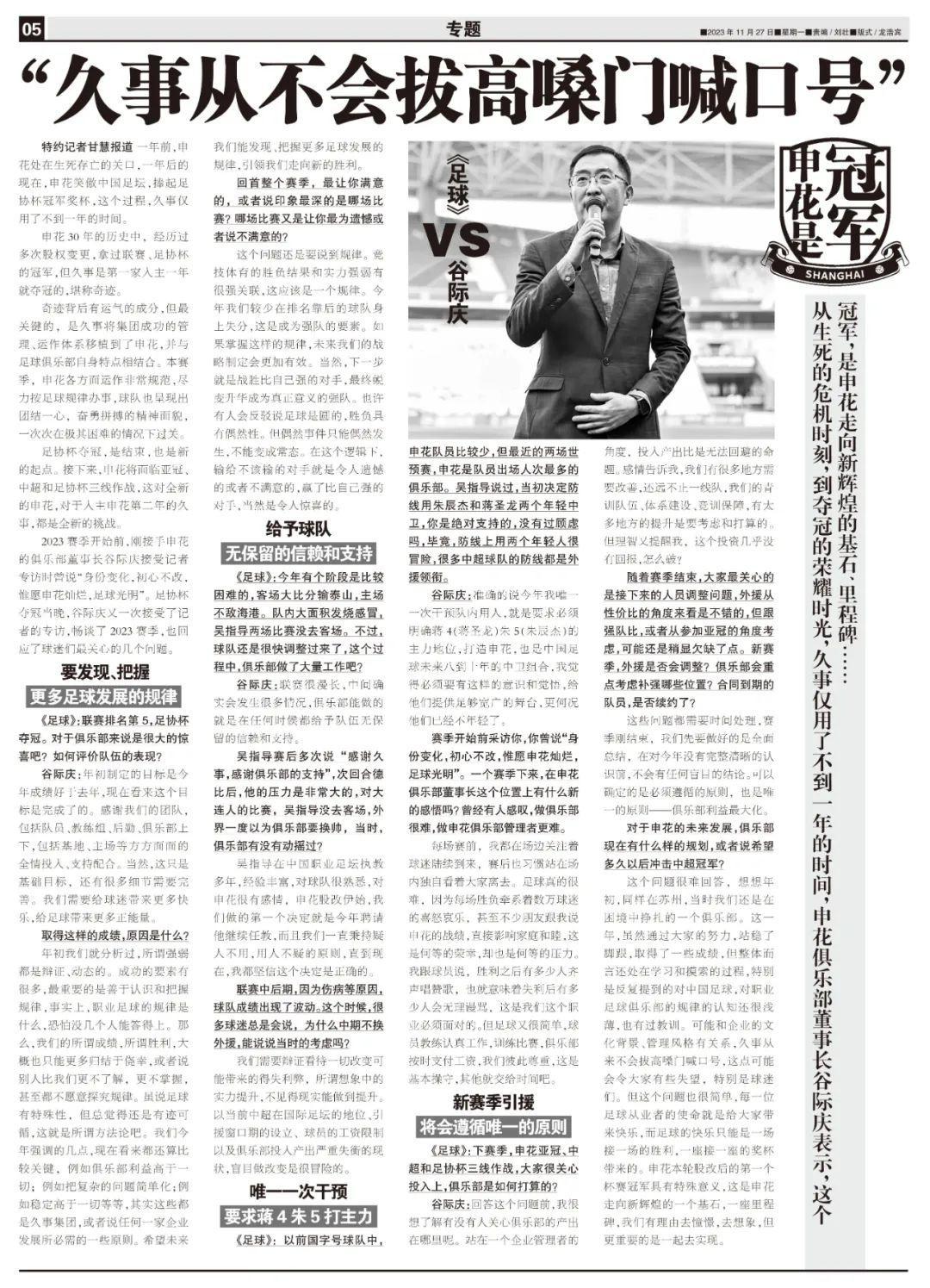 2023賽季開始前,剛接手申花的俱樂部董事長谷際慶接受記者專訪時曾說“身份變化,初心不改,惟願申花燦爛,足球光明”。足協盃奪冠當晚,谷際慶又一次接受了記者的專訪,暢談了2023賽季,也回應了球迷們最關心的幾個問題。
