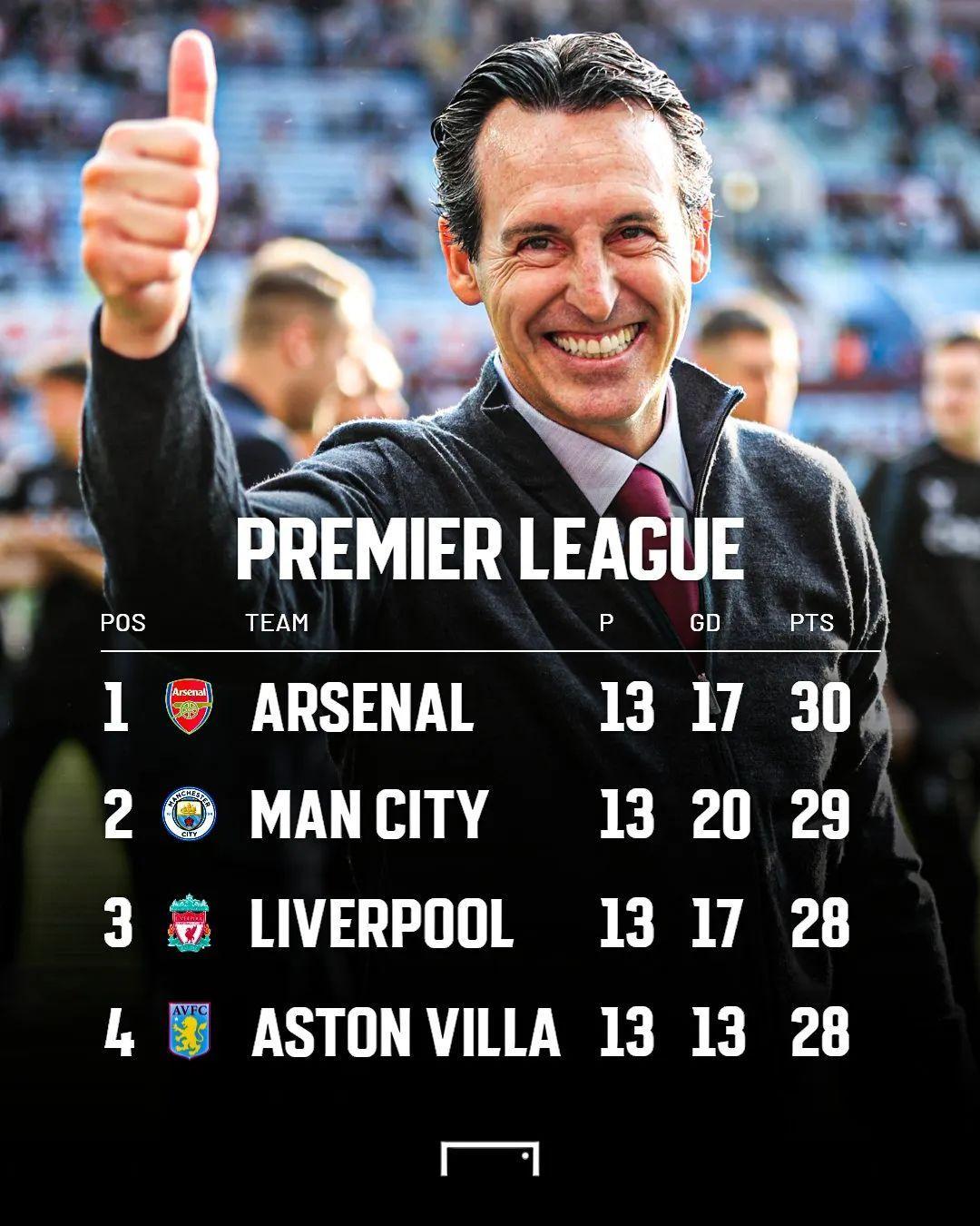 記者寒冰報道 2比1擊敗賽季初風光無限的熱刺,阿斯頓維拉成爲英超新的超級黑馬。去年此時僅排名第15位的維拉,如今高居英超第4,距離榜首的阿森納僅差2分。這是2009年以來,維拉首次在聯賽13輪後排名英超前4位。