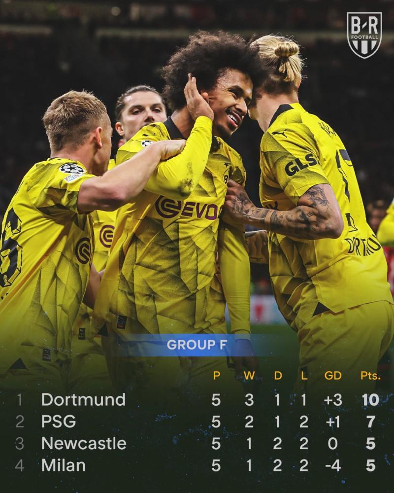 記者寒冰報道 歐冠小組賽第5輪第1比賽日,“死亡F組”的出線席位爭奪依舊緊張刺激。身價最低、開局兩輪不勝的多特蒙德,客場3比1強勢擊敗米蘭,憑藉一波3連勝居然率先突圍出線。而另一場“石油德比”之中,抽籤後被視爲本組戰力領先的巴黎,直到傷停補時階段,才憑藉一個爭議點球1比1絕平紐卡。歐冠末輪開打前,7分的巴黎將客場挑戰10分提前出線的多特,5分的米蘭和紐卡則需要在死拼一場後等待對手臉色。