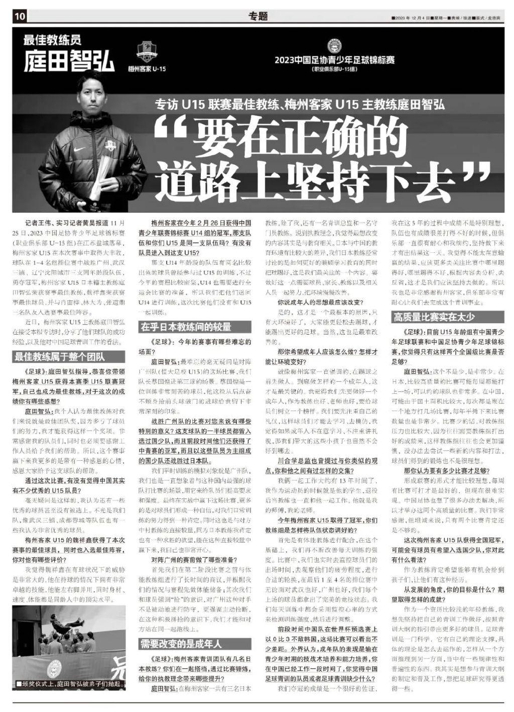 近日,梅州客家U15主教練庭田智弘在接受本報專訪時,分享了他們球隊的成功經驗,以及他對中國足球青訓工作的看法。