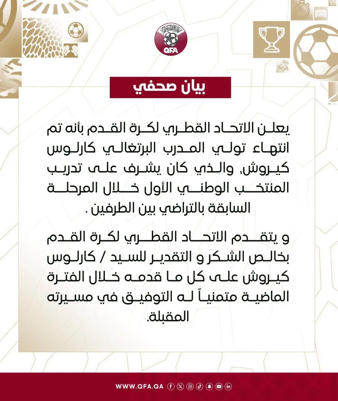 記者寒冰報道 離亞洲盃首戰只剩38天,國足同組最強對手卡塔爾突然宣佈換帥,葡萄牙名帥奎羅斯上任僅10個月就被炒魷魚。中東媒體透露,週一奎羅斯回多哈辦理離職手續時,卡塔爾足協已選定繼任者——而在官宣奎羅斯離任後不久,卡塔爾就宣佈此前執教卡塔爾聯賽瓦克拉隊的西班牙教練馬克斯·洛佩斯,將帶隊出戰亞洲盃。