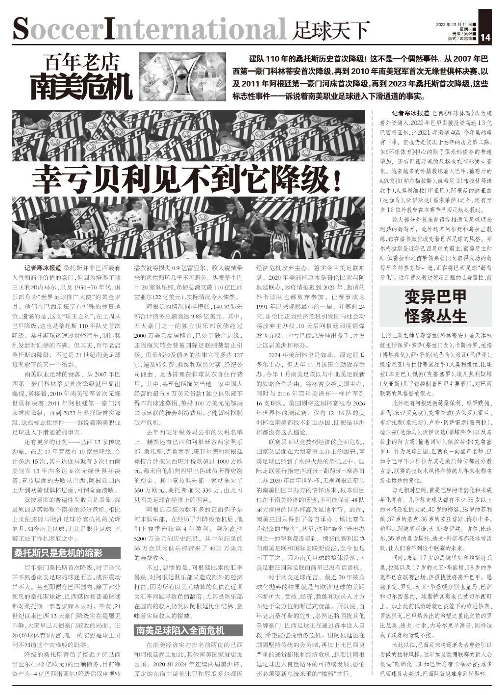 南美職業足球的衰落,從2007年巴西第一豪門科林蒂安首次降級就已顯出端倪,緊接着,2010年南美冠軍首次無緣世俱杯決賽、2011年阿根廷第一豪門河牀首次降級,再到2023年桑托斯首次降級,這些標誌性事件一一訴說着南美職業足球進入下滑通道的事實。