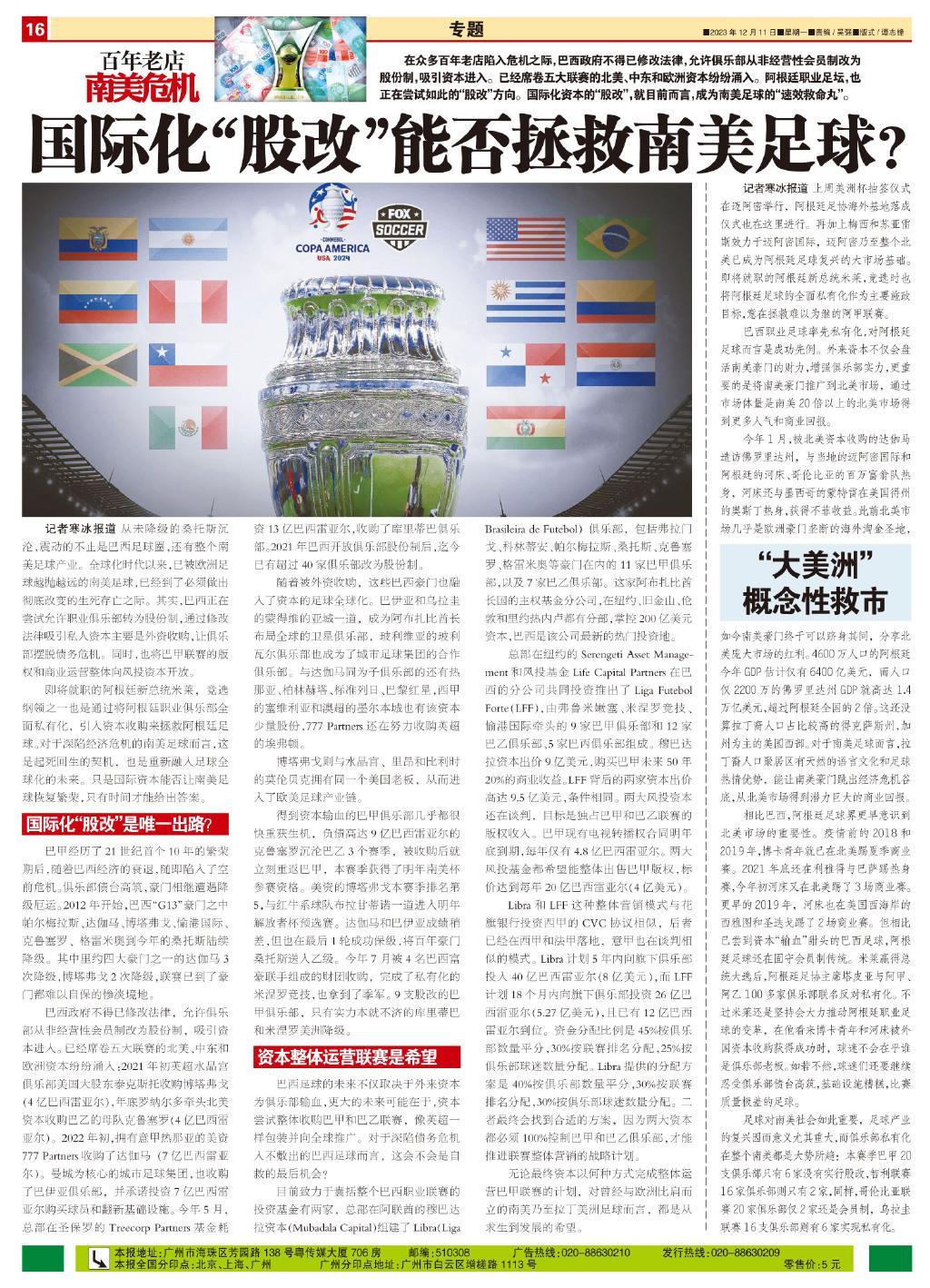 在衆多百年老店陷入危機之際,巴西政府不得已修改法律,允許俱樂部從非經營性會員制改爲股份制,吸引資本進入。已經席捲五大聯賽的北美、中東和歐洲資本紛紛湧入。阿根廷職業足壇,也正在嘗試如此的“股改”方向。國際化資本的“股改”,就目前而言,成爲南美足球的“速效救命丸”。