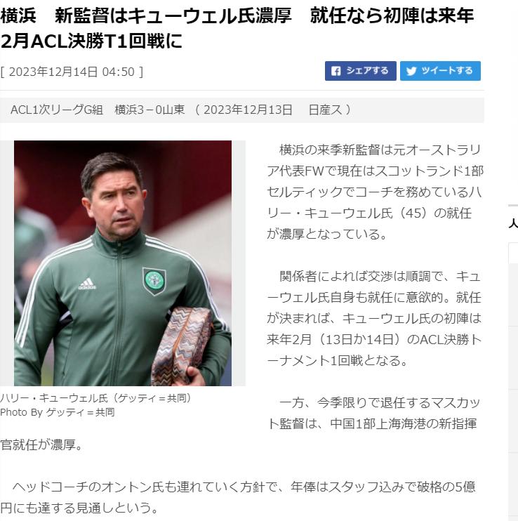 日本《體育報知》報道稱:海港向馬斯卡特教練團隊開出了5倍的薪資報價,他們在水手年薪是1億日元(約65萬歐元),海港的報價是5億日元(約325萬歐元)。