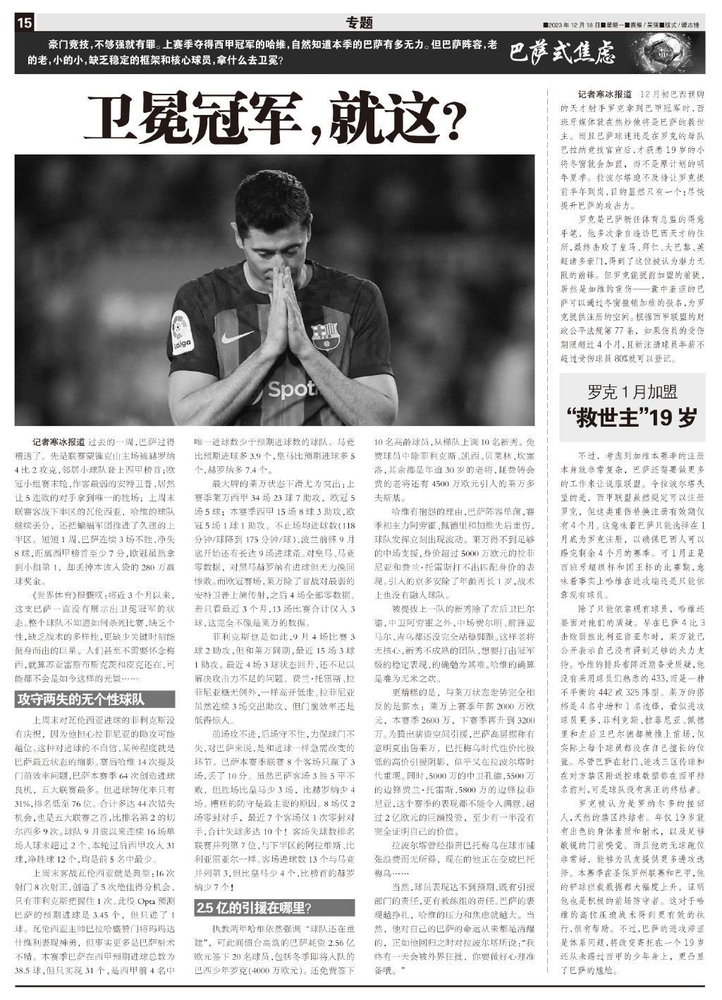 哈維有抱怨的理由,巴薩陣容單薄,賽季初主力阿勞霍、佩德里和加維先後重傷,球隊發揮立刻出現波動。萊萬得不到足夠的中場支援,身價超過5000萬歐元的拉菲尼亞和費蘭·託雷斯打不出匹配身價的表現。引入的京多安除了年齡再長1歲,戰術上也沒有融入球隊。