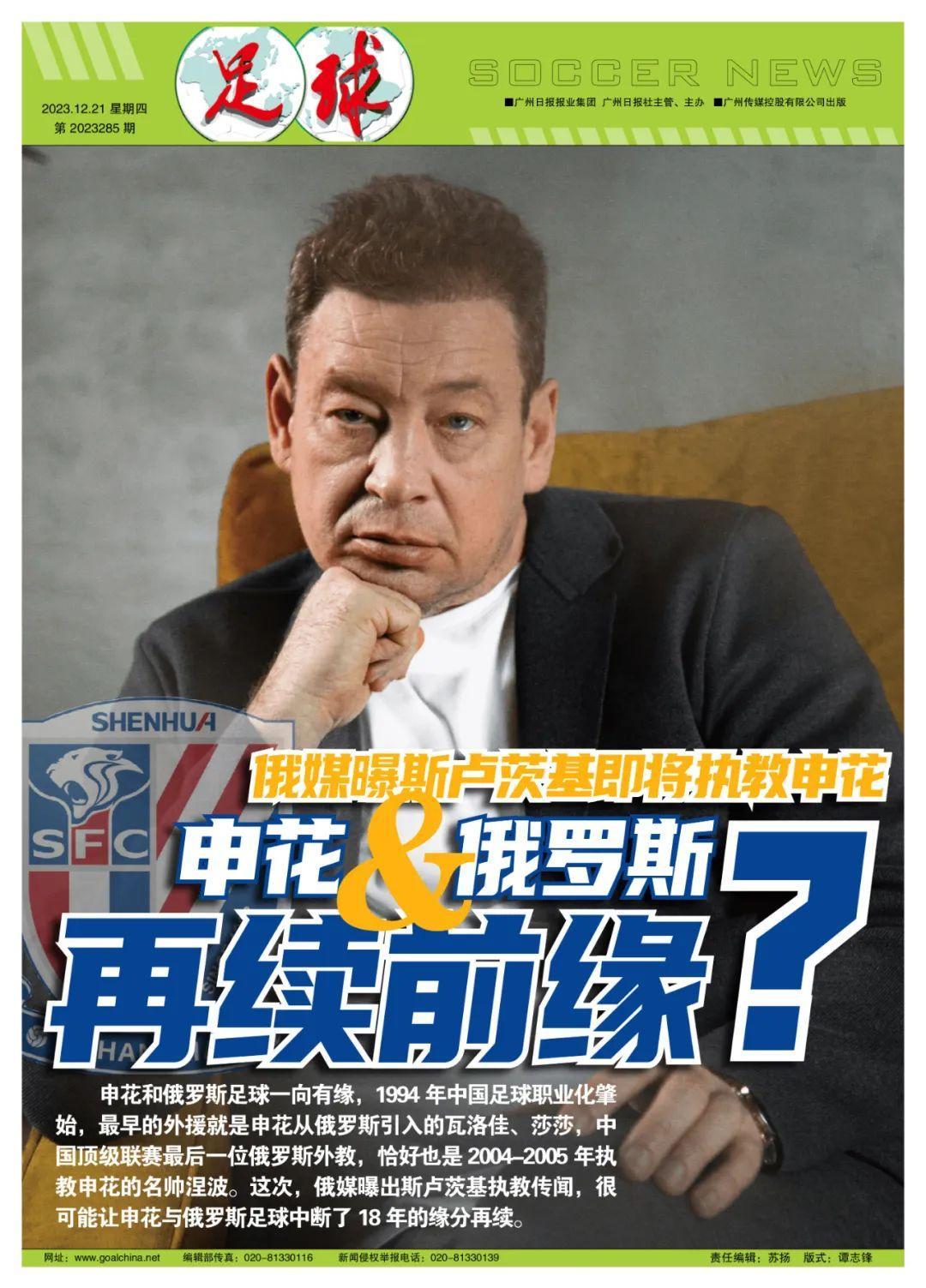記者寒冰報道 12月20日,俄羅斯記者伊萬·卡爾波夫爆料,稱前莫斯科中央陸軍及俄羅斯國家隊主帥斯盧茨基已與申花達成一致,而且連教練團隊人選都已確定。很快,俄羅斯權威的《蘇維埃體育》、《體育快報》等媒體也報道了斯盧茨基即將執教申花的消息。