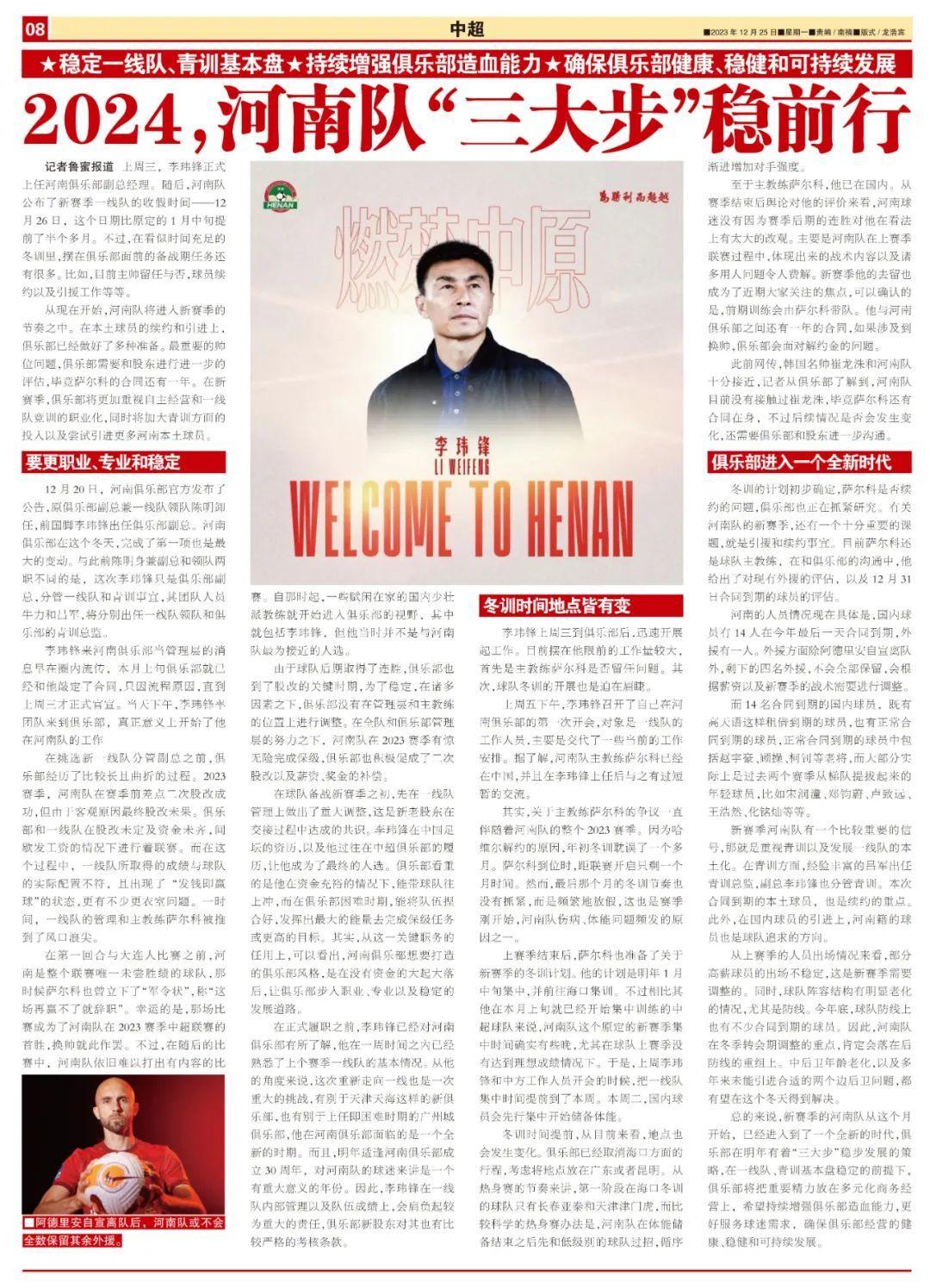 記者魯蜜報道 上週三,李瑋鋒正式上任河南俱樂部副總經理。隨後,河南隊公佈了新賽季一線隊的收假時間——12月26日,這個日期比原定的1月中旬提前了半個多月。不過,在看似時間充足的冬訓裏,擺在俱樂部面前的備戰期任務還有很多。比如,目前主帥留任與否,球員續約以及引援工作等等。