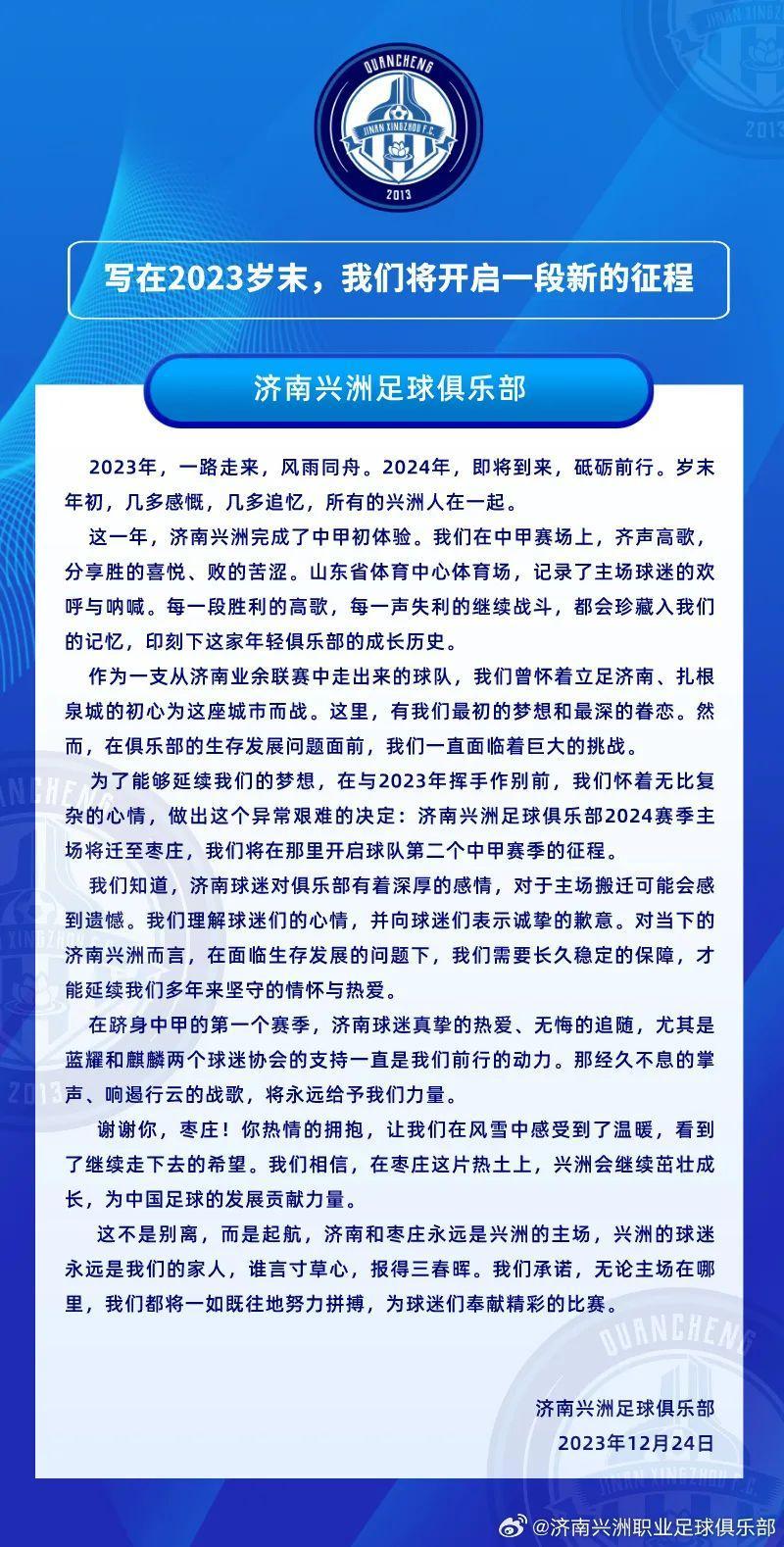 濟南興洲在官宣中表示:“爲了延續我們的夢想,在與2023年揮手作別前。我們懷着無比複雜的心情,做出了這個異常艱難的決定:濟南興洲足球俱樂部2024賽季的主場遷至棗莊,我們將在那裏開啓球隊第二個中甲賽季的征程。”談及原因,濟南興洲表示:“在面臨生存發展的問題下,我們需要長久穩定的保障,才能延續我們多年來堅守的情懷與熱愛。”