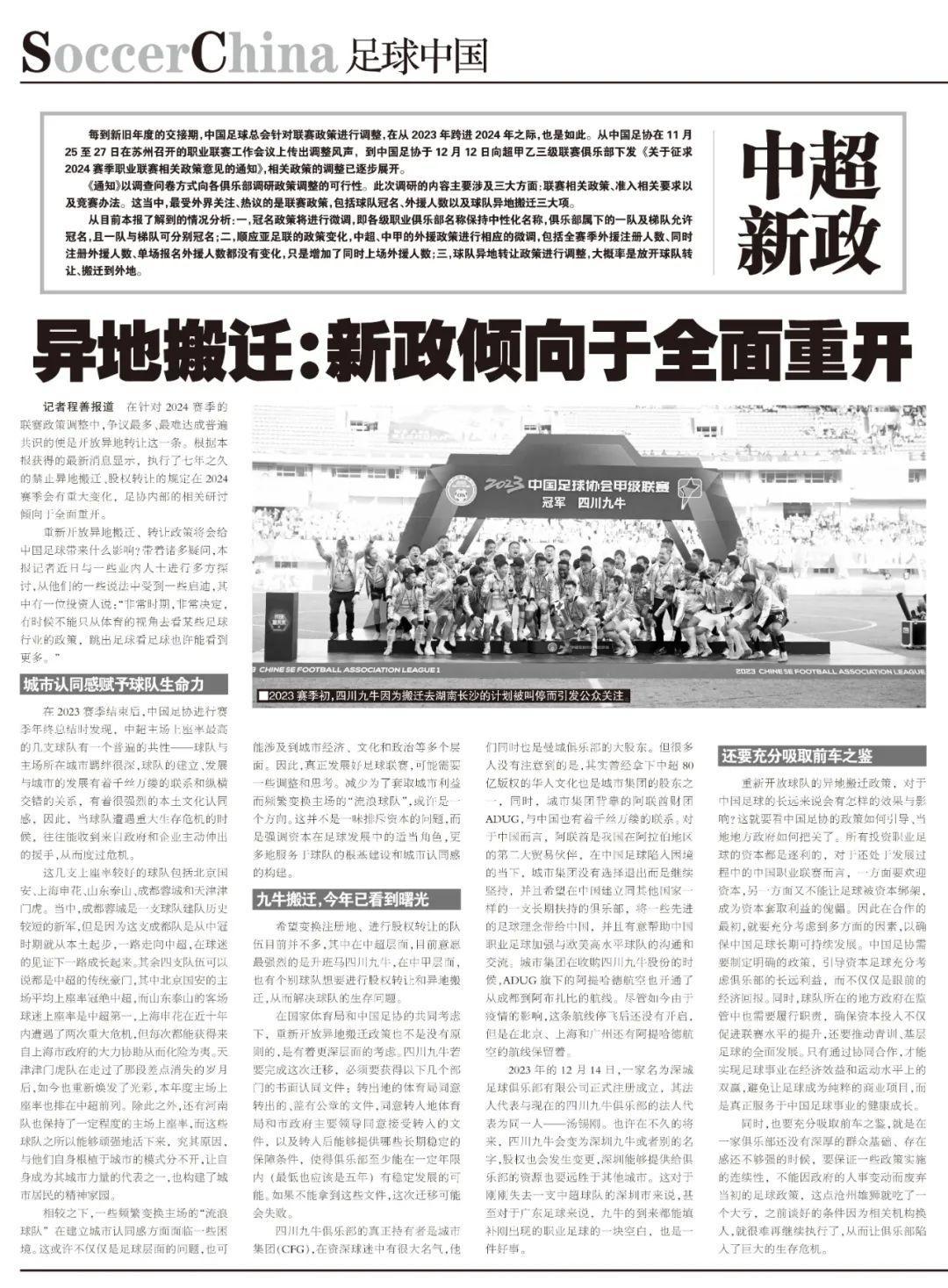 在針對2024賽季的聯賽政策調整中,爭議最多、最難達成普遍共識的便是開放異地轉讓這一條。根據本報獲得的最新消息顯示,執行了七年之久的禁止異地搬遷、股權轉讓的規定在2024賽季會有重大變化,足協內部的相關研討傾向於全面重開。