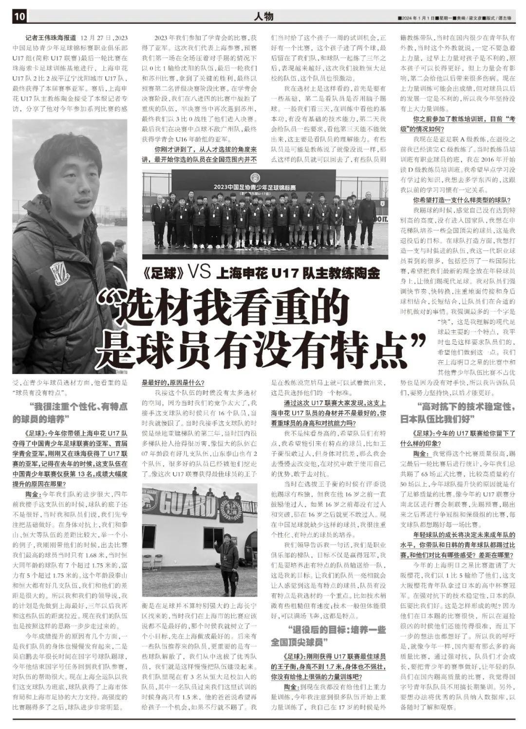 記者王偉珠海報道 12月27日,2023中國足協青少年足球錦標賽職業俱樂部U17組(簡稱U17聯賽)最後一輪比賽在珠海索卡足球訓練基地進行,上海申花U17隊2比2戰平遼寧瀋陽城市U17隊,最終獲得了本屆賽事亞軍。賽後,上海申花U17隊主教練陶金接受了本報記者專訪,分享了他對今年參加系列比賽的感受,在青少年球員選材方面,他看重的是“球員有沒有特點”。