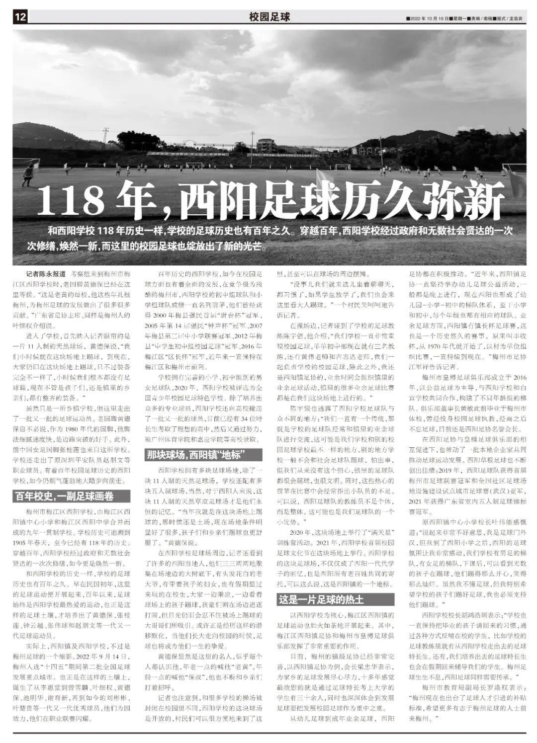 實際上,西陽鎮及西陽學校,不過是梅州足球的一個縮影。2022年9月14日,梅州入選“十四五”期間第二批全國足球發展重點城市。也正是在這樣的土壤上,誕生了從李惠堂到曾雪麟、葉細權、黃德保、池明華、謝育新,再到如今的劉彬彬、葉楚貴等一代又一代優秀球員,他們爲國效力,他們在職業聯賽閃耀。