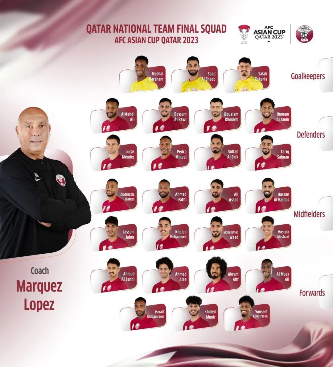 名單內,卡塔爾有多達15名歸化球員,不過,陣容老化比較嚴重。除了進攻三叉戟,中後場幾乎都是30歲以上的老將。主力門將謝布、3位歸化後衛門德斯、胡希和佩德羅都是33歲以上,埃及裔後腰法蒂、蘇丹裔中場哈泰姆也都在30歲以上。只有左後衛胡曼和埃及裔中場馬沙爾年齡低於25歲。但在亞洲盃上,33歲的隊長海多斯不出意外會取代馬沙爾首發,進一步提升了球隊首發陣容的平均年齡。