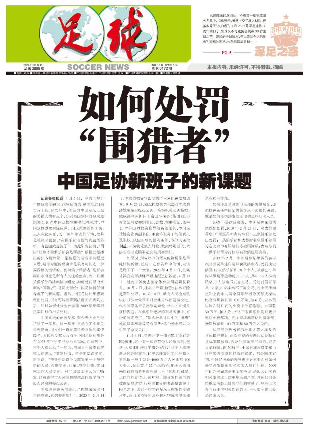 從已經公告出來的杜兆纔等人涉及的具體指控來看,此次央視的專題片即便是有具體案情披露,涉及到俱樂部層面的,應該只是行賄。但2024年,中國足球反腐案和由遼寧警方負責的打假打賭案,都會陸續宣判。中國足協新的領導班子必然要面對如何處罰涉案俱樂部和涉案人員的問題。