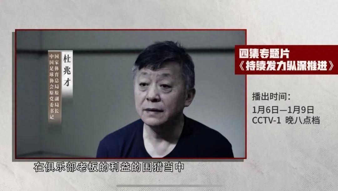 記者魯蜜報道 1月5日,中央電視臺年度反腐專題大片《持續發力 縱深推進》預告片上線,預告片中,涉及到中國足壇反腐的關鍵人物有三個,分別是國家體育總局原副局長&原中國足協黨委書記杜兆才、中國足協原主席陳戌源、國足原主教練李鐵。