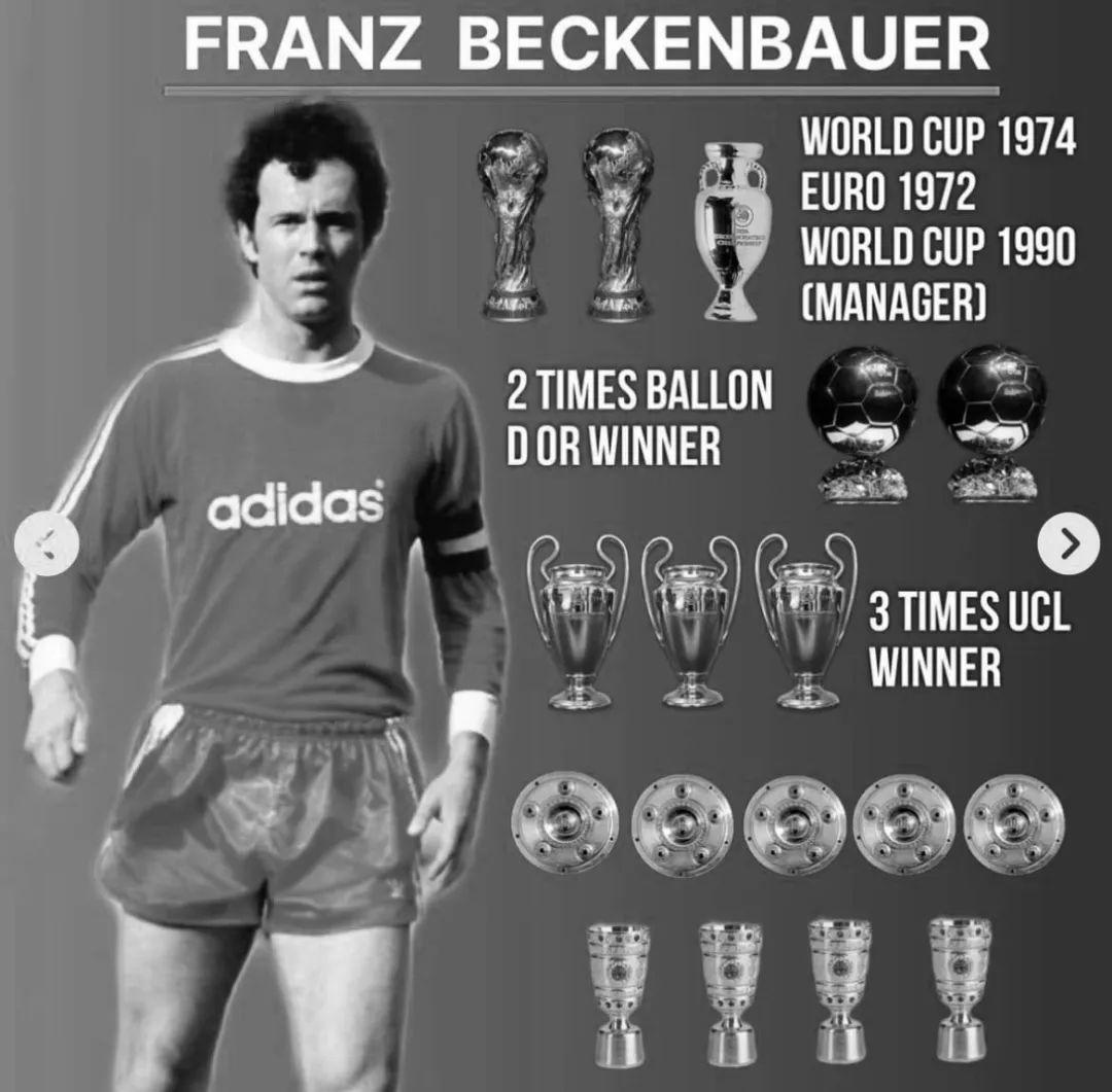 貝肯鮑爾是真正的大滿貫球員,將拜仁從小球會推上德國足壇霸主位置,一路帶到歐洲之巔。無論在拜仁還是德國國家隊,貝肯鮑爾都是那個年代當仁不讓的統治級領袖。球員時代世界盃、歐洲盃他都兩度進入決賽獲得冠亞軍各1個,歐冠拿到3連冠還有2個金球獎。40多年後,世界球迷才能再次感受到防守球員拿到金球獎,以及歐冠3連冠的偉大。