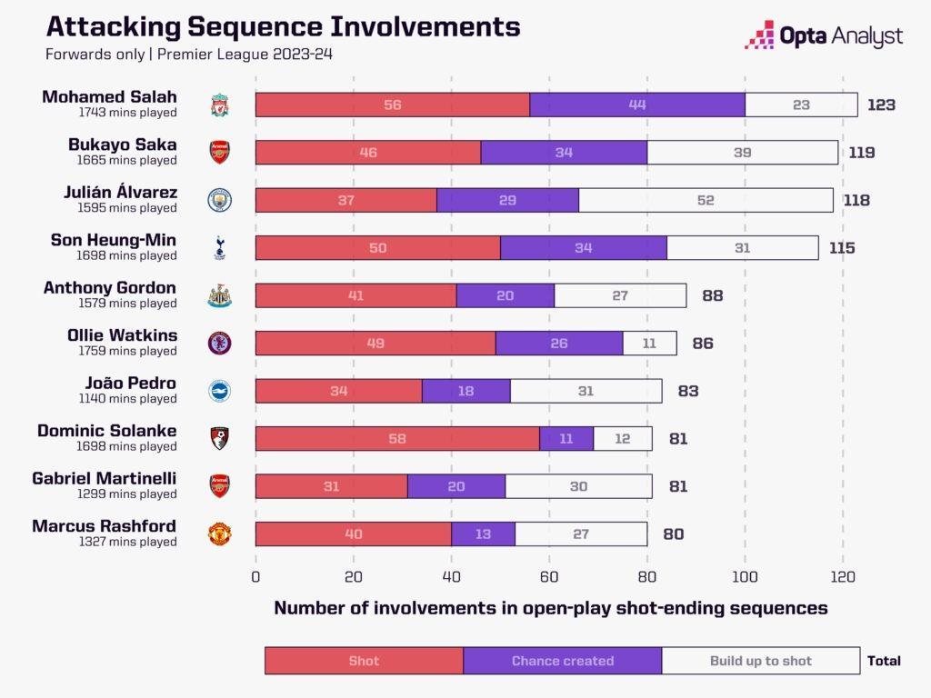 作爲現役亞洲一哥的孫興慜自不必說,Opta重點提及了孫興慜本賽季的表現,在新波叔治下,他20場聯賽收穫12球5助攻,綜合進攻火力已經超越了上賽季的36場10球6助攻。孫興慜是英超僅有的4位創造威脅機會過百的球員(115次)之一,而在這四人之中,他最終收穫的進攻成果也僅次於薩拉赫(4人中的另外兩位是薩卡和阿爾瓦雷斯)。