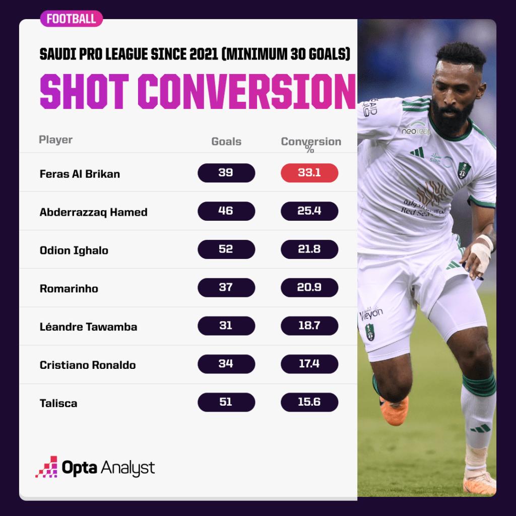 年僅23歲的沙特攻擊手布賴坎已經代表國家隊出場38次。最近3年,布賴坎在沙特聯賽收穫39球,但更值得稱道的是,他是沙特聯賽同期進30球以上的射手中,射門轉化率最高的(33.1%),他也被視作沙特爭冠的王牌選手。
