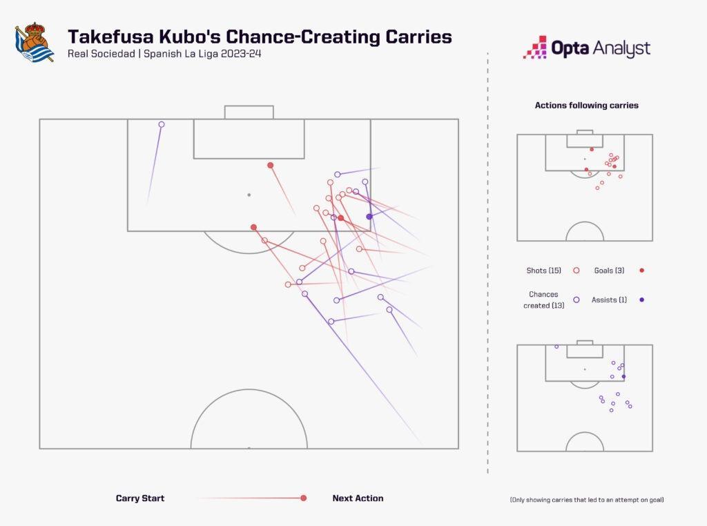 久保健英本賽季在西甲交出6球3助攻的出色答卷,綜合進攻火力甚至壓過7球1助攻的皇家社會頭牌奧亞薩瓦爾,他在npxG(非點球預期進球)值僅2.6的情況下打進6球,npxG差爲+3.4,這一數據在西甲僅次於貝林厄姆(+5.8)。右側內切射門是他的強項,他用這一進球方式收穫的進球,僅次於羅德里戈和威廉姆斯。