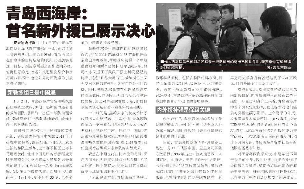 記者陳永報道 1月3日下午,青島西海岸從青島飛赴廣東佛山三水,開啓了第一階段的冬訓。作爲升班馬,青島西海岸在新賽季的目標是站穩腳跟,而要想實現這一目標,西海岸需要全面引進內外援,值得注意的是,首名外援恩裏克身價和履歷都非常不錯,也讓外界對西海岸的引援充滿了期待。