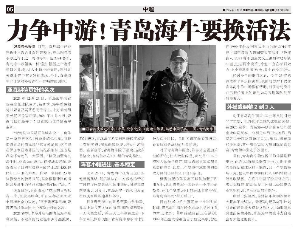 記者陳永報道 目前,青島海牛已經在新任主教練亞森的帶領下,在昆明紅塔基地進行了近一週的冬訓。在2024賽季,青島海牛希望換一種活法,擺脫上個賽季保級的處境,進入中超中游集團,同時在關鍵比賽中有更好的表現,爲此,青島海牛已計劃對外援進行一定幅度的調整。